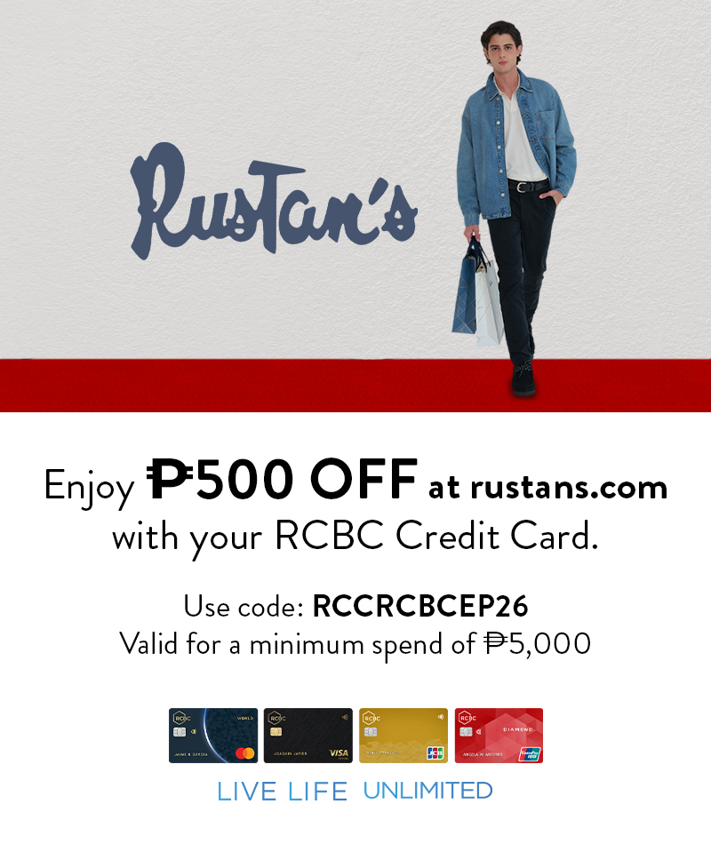 - Qualified cardholders can enjoy ₱500 OFF sitewide for a minimum single-receipt purchase of ₱5,000 at Rustans.com with their RCBC Credit Card using the promo code RCCRCBCEP26.