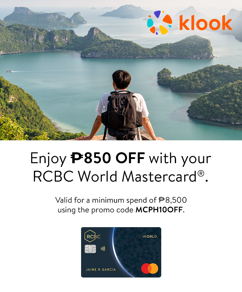Eligible cardholders are entitled to enjoy ₱850 OFF with a minimum spend of ₱8,500 using an RCBC World Mastercard and promo code MCPH10OFF when booking through thededicated Mastercard x Klook website. Each eligible Cardholder can enjoy the discount up to 3 times in total during the promotion period.