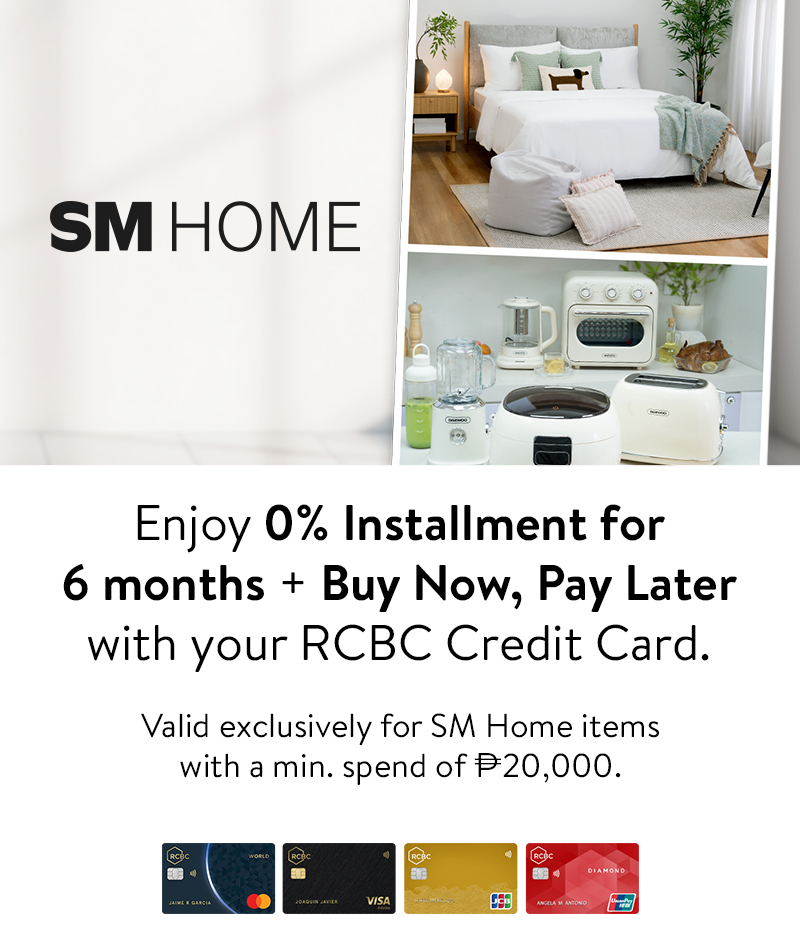 - Cardholders can avail of 0% Installment for 6 months and Buy Now Pay Later* scheme on all items for a minimum single-receipt purchase of ₱20,000 using their RCBC Credit Card during the promo period.