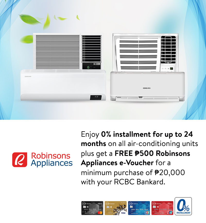 Cardholder are entitled to a FREE ₱500 Robinsons Appliances e-voucher for a minimum single-receipt 0% installment purchase of ₱20,000 on all air-conditioning units using their RCBC Bankard.