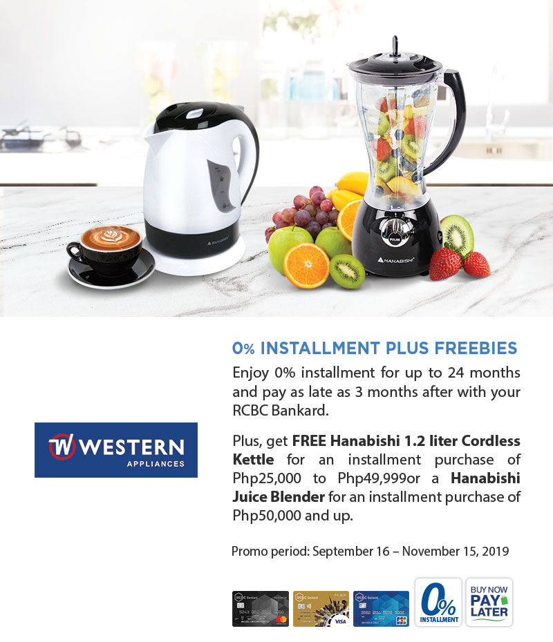 • Free Hanabishi 1.2 liter Cordless kettle for an installment purchase of Php 25,000 to Php 49,999