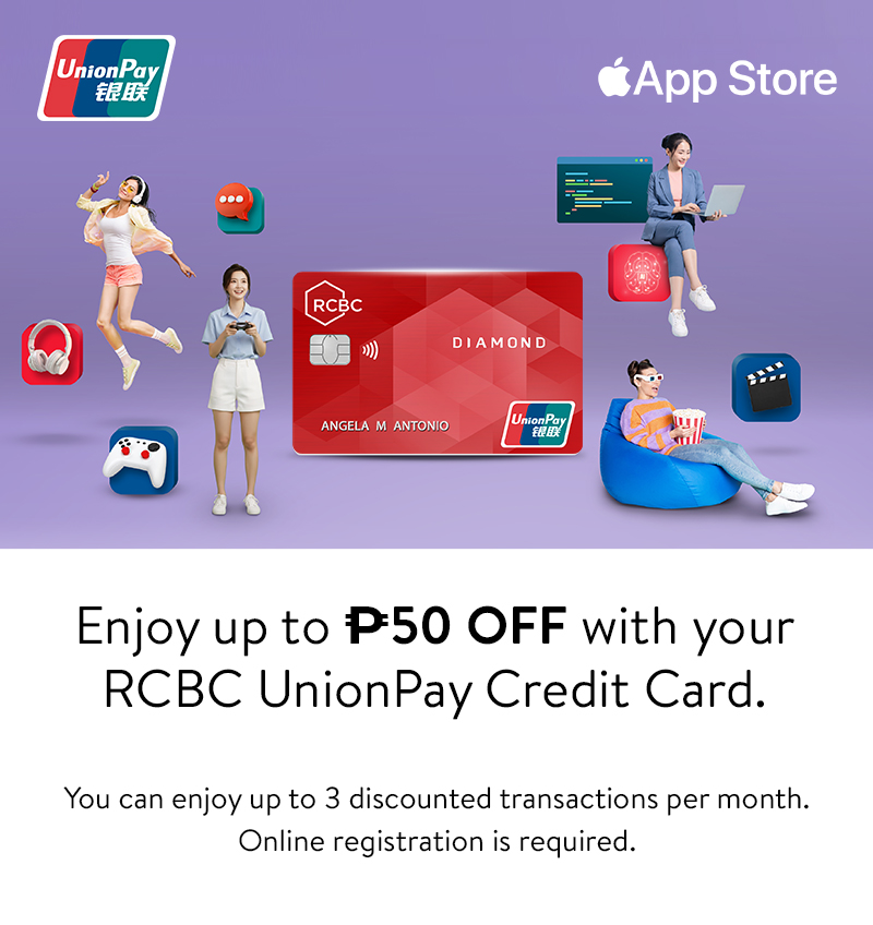 This promotion is applicable only to purchases made in Philippines Apple App Store. Cardholders must add the successfully registered RCBC UnionPay credit card in advance to their Apple Account payment methods.
