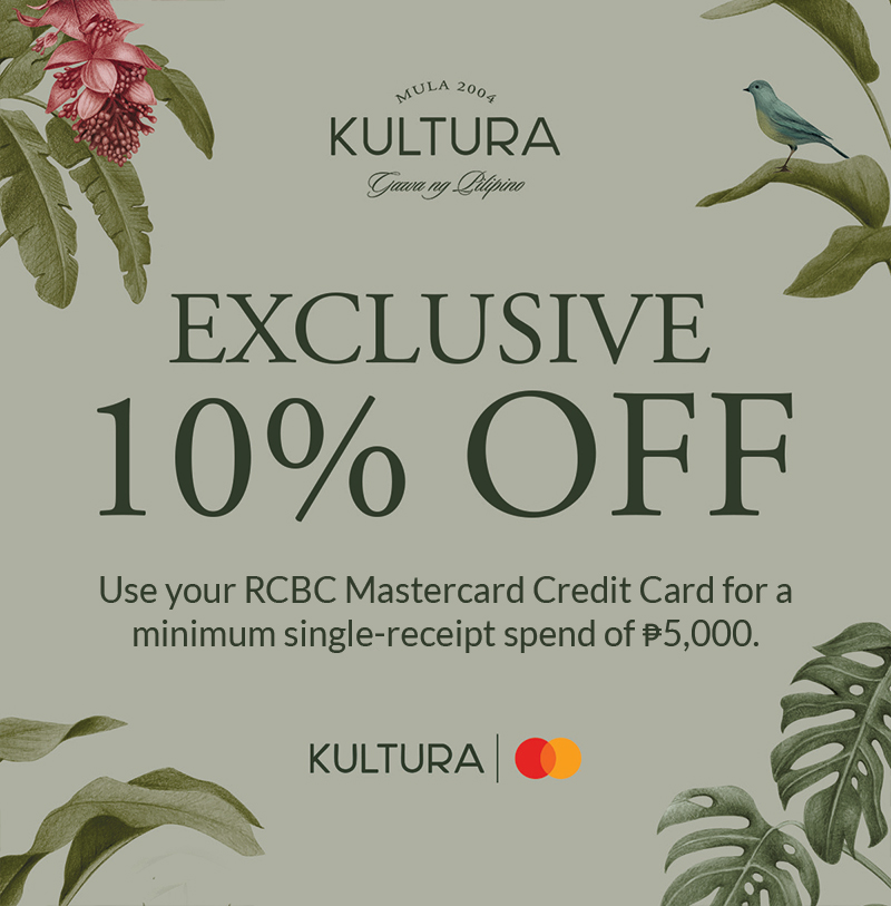 - RCBC Mastercard Credit Cardholders can enjoy 10% OFF with a minimum single-receipt purchase of ₱5,000 (straight or installment transaction) at any Kultura branch nationwide during the promo period.