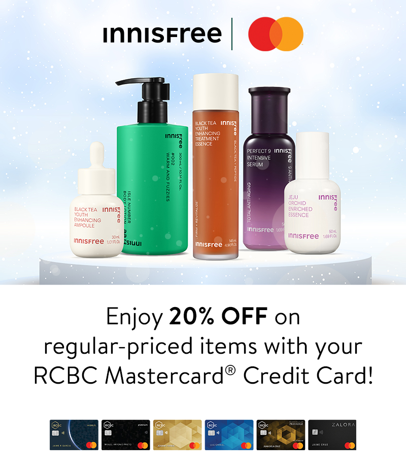 - Cardholders can enjoy 20% OFF for a minimum single receipt purchase of ₱4,000 on regular priced items using their RCBC Mastercard Credit Card in any participating Innisfree branch.