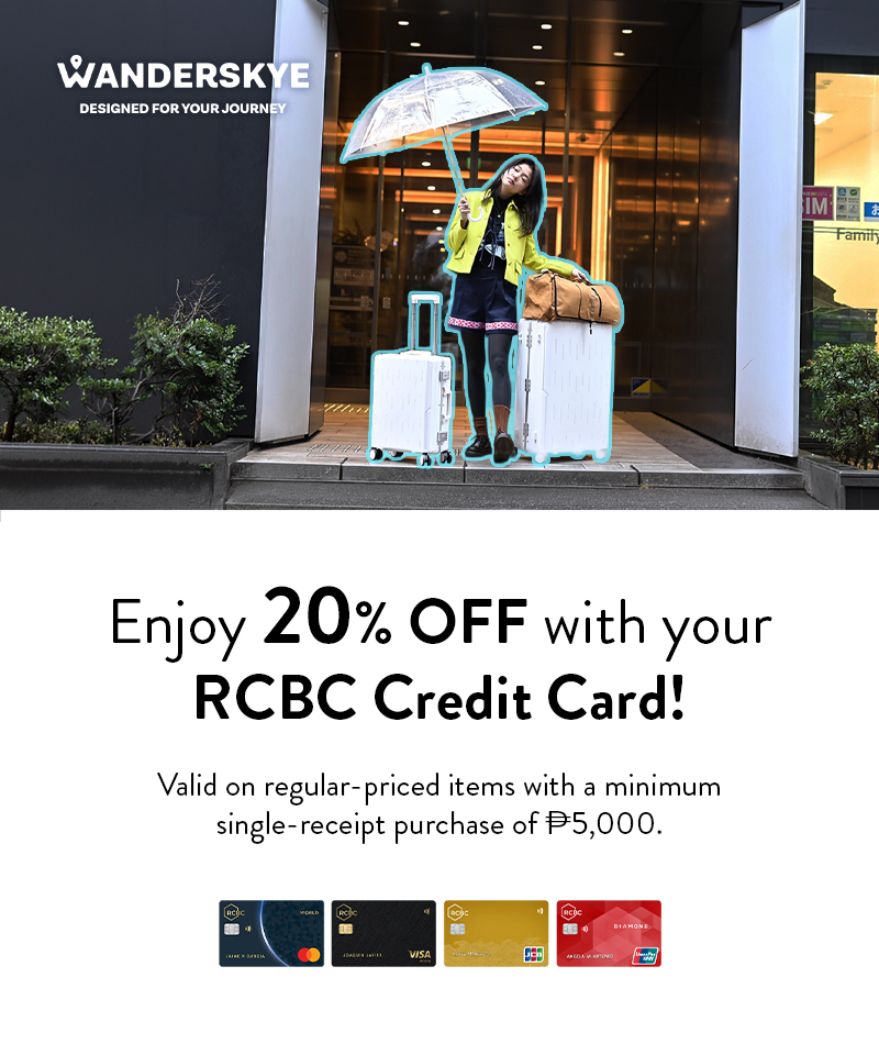 - Cardholders can avail of 20% OFF on regular-priced Wanderskye products with a minimum single receipt purchase of ₱5,000 using their RCBC Credit Card during the promo period.