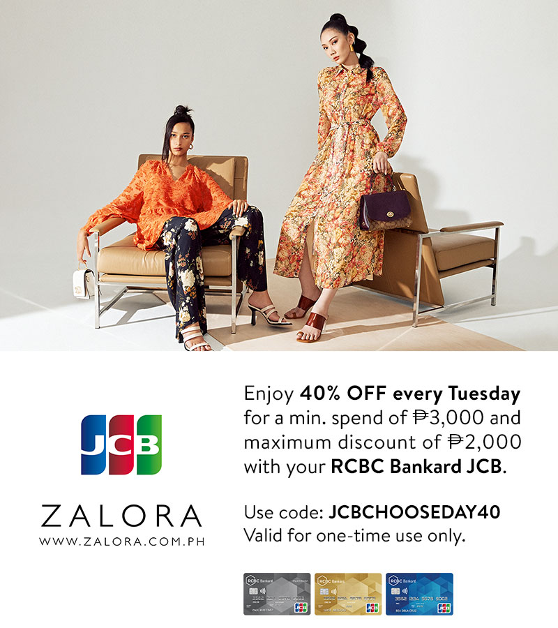- RCBC Bankard JCB cardholders are entitled to get a 40% DISCOUNT for a ₱3,000 minimum spend requirement and ₱2,000 maximum discount, one-time use per account, to be availed using the voucher code: JCBCHOOSEDAY40 to be inputted by the cardholder upon checkout on ZALORA website or app.