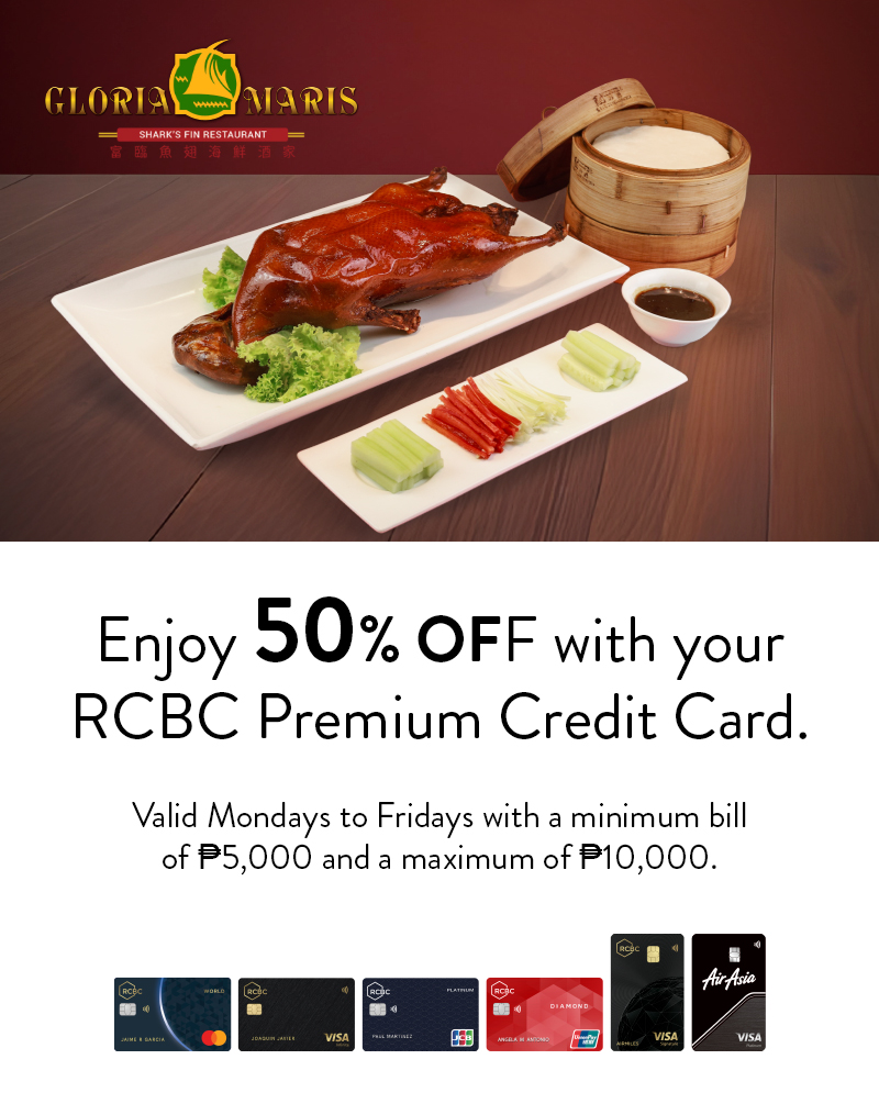 - Eligible cardholders are entitled to enjoy 50% OFF at GLORIAMARIS Greenhills for dine-in transactions with a minimum single-receipt food bill of ₱5,000 and a maximum of ₱10,000, following the schedule below: