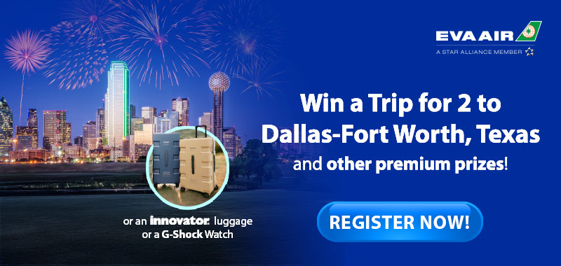 Score a chance to win a Round-Trip Ticket for 2 to Dallas via EVA Air, an Innovator luggage set, or a G-Shock Watch!