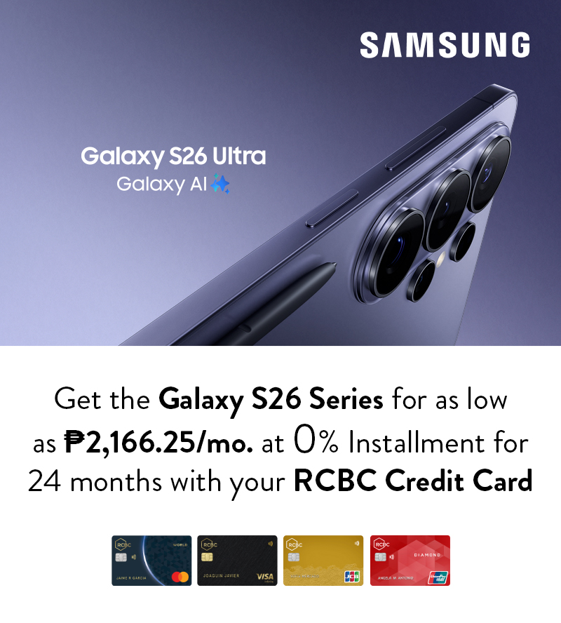 - The promo entitles Cardholders to exclusive discounts and free memory upgrade* on the Samsung Galaxy S26 Series and Galaxy Buds 4 when they use their RCBC Credit Cards to purchase at 0% installment for 24 months at participating Samsung Experience and Premium stores during the Special Pre-order period from March 5 to 8, 2026.