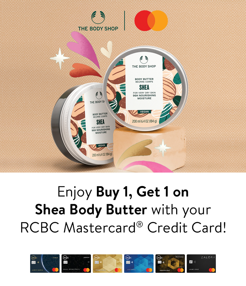 Cardholders who purchase Shea Body Butter 200ml will receive one additional item of the same kind for free using RCBC Mastercard Credit Card in any participating The Body Shop branch.
