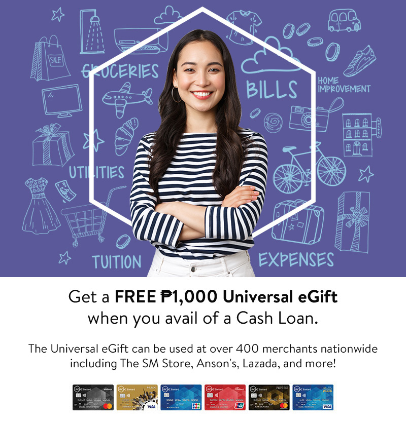 Qualified cardholders must avail of a minimum of ₱50,000 CASH LOAN and at least loan term of 12 months to receive the free ₱1,000 Universal eGift offer.