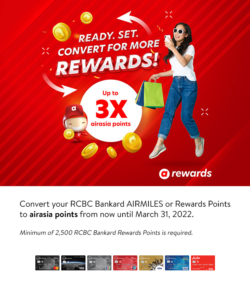 *Minimum of 2,500 RCBC Bankard Rewards Points. No max. capping per transaction per airasia member. - Enjoy up to 3X airasia points when you convert from March 1 to 31, 2022.