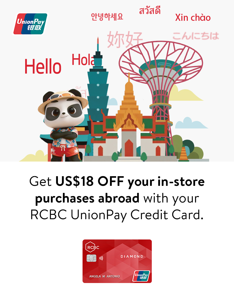 - Get US$18 OFF your in-store purchases abroad with your RCBC UnionPay Credit Card during the promo period.