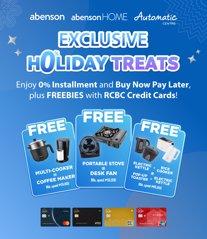 Buy Now Pay Later is not available for online purchases. - Promo is not valid in conjunction with existing promotional offers of RCBC Credit Cards and Abenson, AbensonHome, and Automatic Centre.