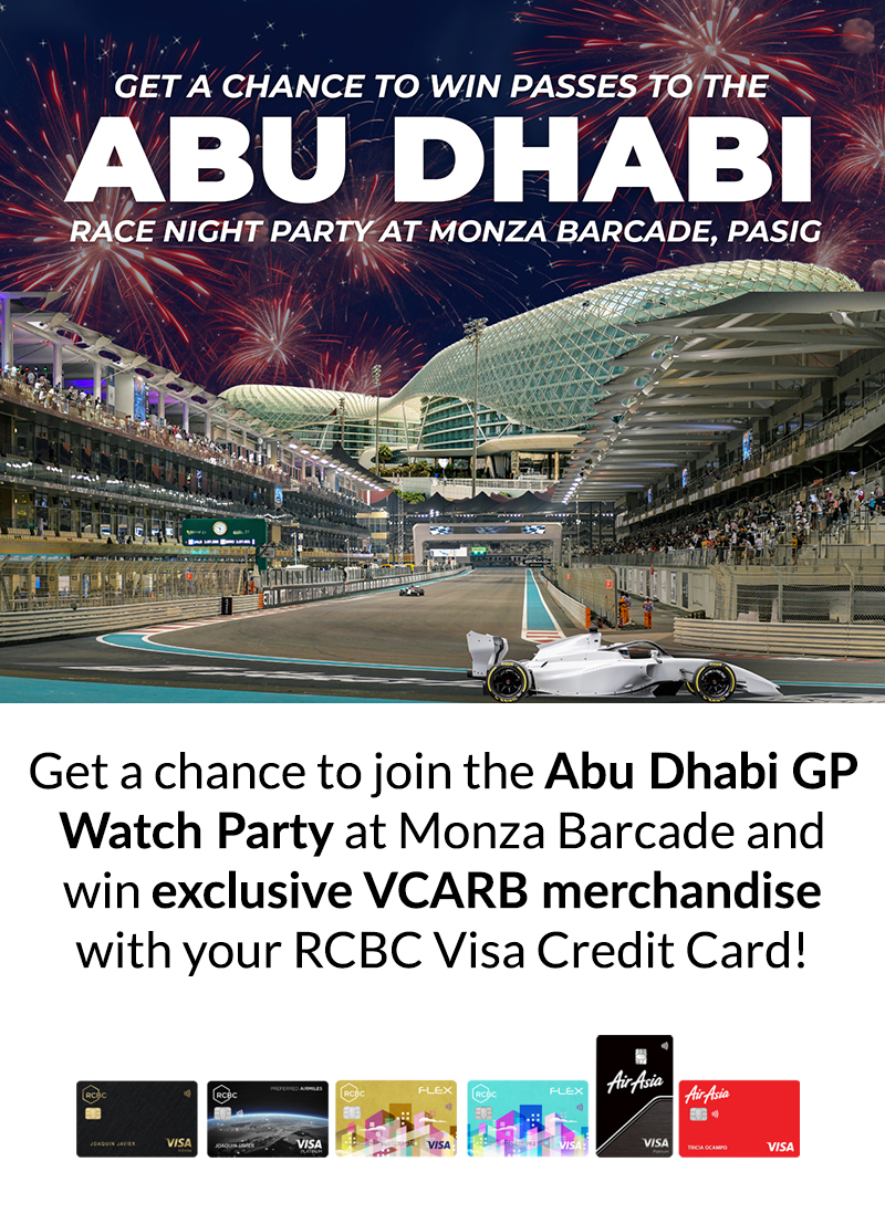 October 15 – November 5, 2025 | November 7, 2025 | 10 winners Each winner gets 2 passes to the RCBC Visa F1 Watch Party + 1 F1 Merch/Cap |