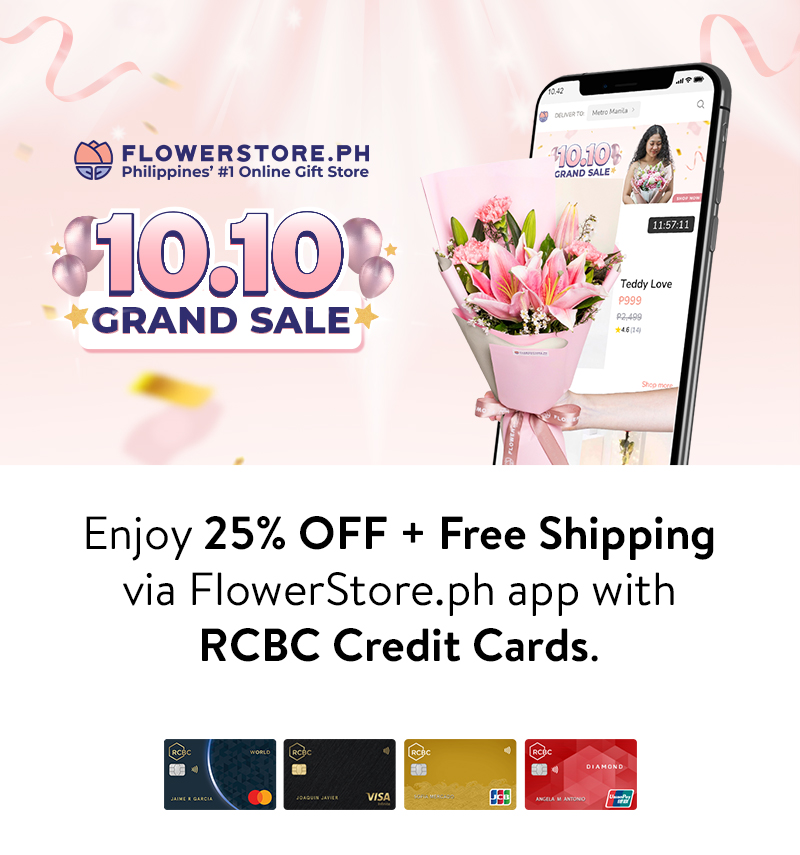 - Cardholders can avail of 25% OFF (capped at ₱250 discount) plus free shipping via the FlowerStore.ph app with their RCBC Credit Card using the promo code: RCBC99 during the promo period.