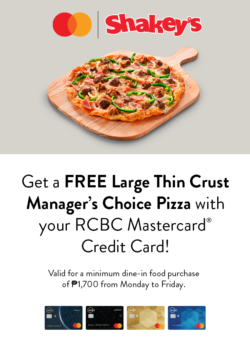 - RCBC Mastercard Credit Cardholders may enjoy a FREE Large Thin Crust Manager's Choice Pizza (valued at ₱619) with a minimum single-receipt dine-in food purchase of ₱1,700.