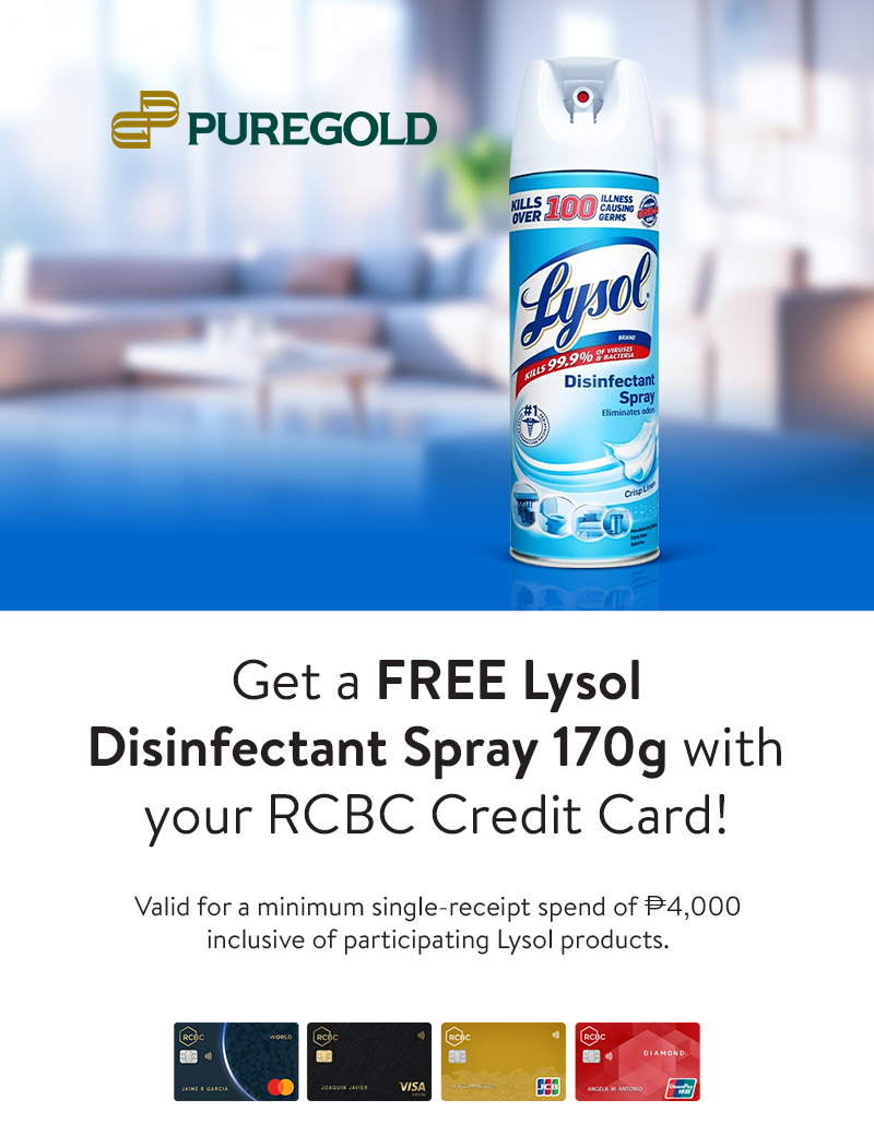 Redemption is until April 1, 2026. - To qualify for the promo, the cardholder must use any qualified RCBC Credit Card within the promo period for a minimum single-receipt spend of ₱4,000, inclusive of any participating Lysol product, at participating Puregold stores.