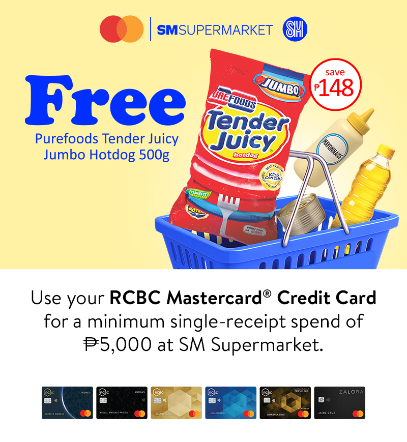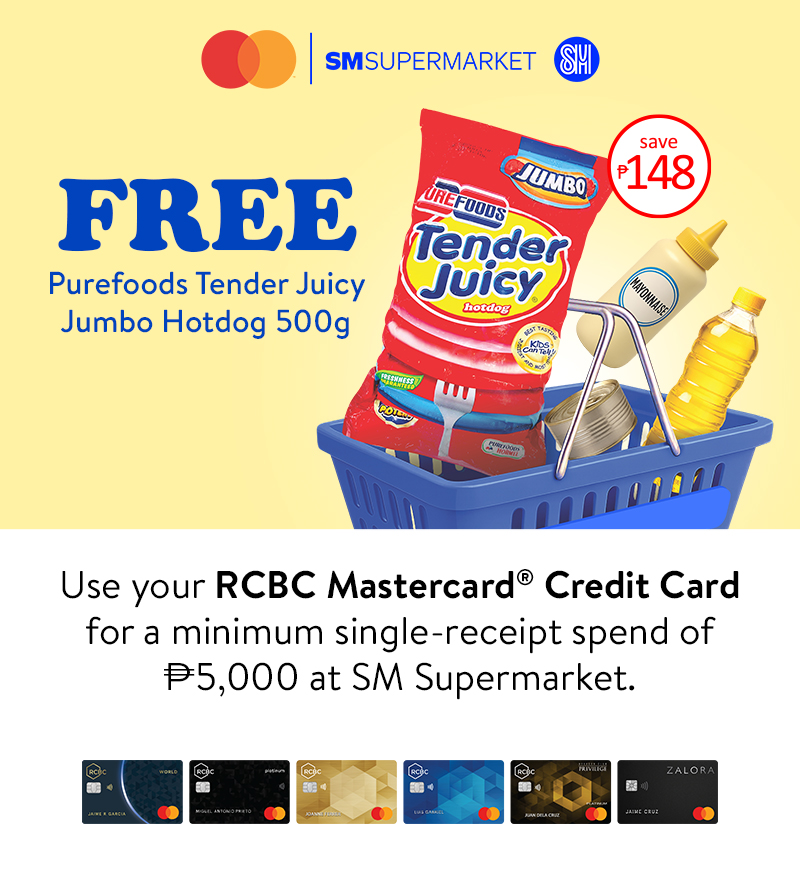 - A minimum single-receipt straight or installment transaction of ₱5,000 from any participating SM Supermarket branch paid using an RCBC Mastercard Credit Card entitles the cardholder a FREE Purefoods Tender Juicy Jumbo Hotdog 500g.