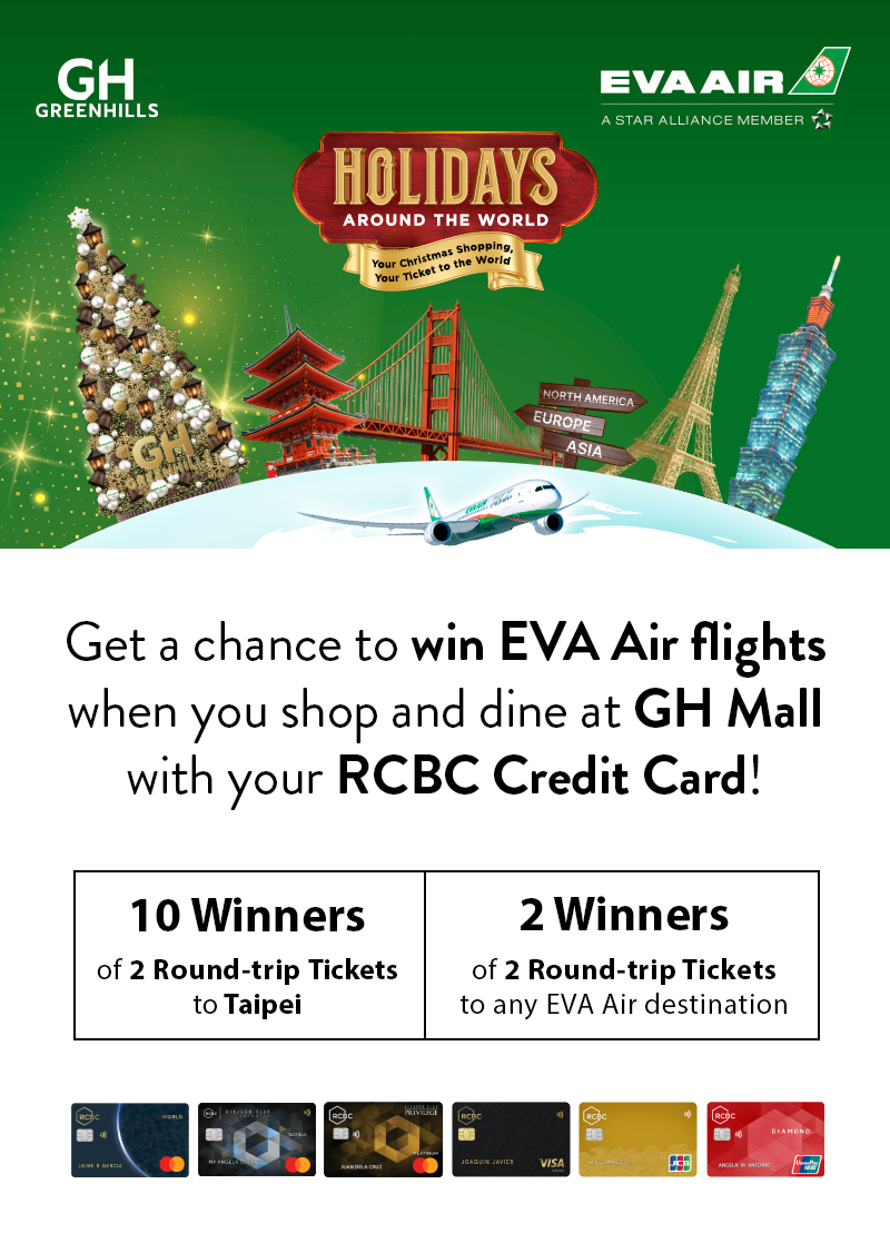 - The RCBC Credit Cards, EVA Air, and Greenhills Mall’s Holidays Around The World Raffle Promo (“The Promo”) is open to all the shoppers of the Greenhills Mall (GH Mall).