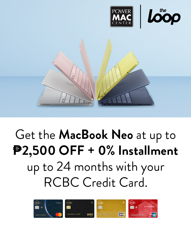 - The promo entitles the Cardholders to get up to ₱2,500 OFF based on the SRP of the MacBook Neo at 0% Installment for 12 & 24 months, plus Buy Now, Pay Later* using their RCBC Credit Cards during the promo period.