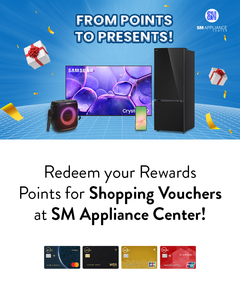 - Eligible RCBC Credit Cardholders may use their Rewards Vouchers in any branch of the participating branches of SM Appliance Center.