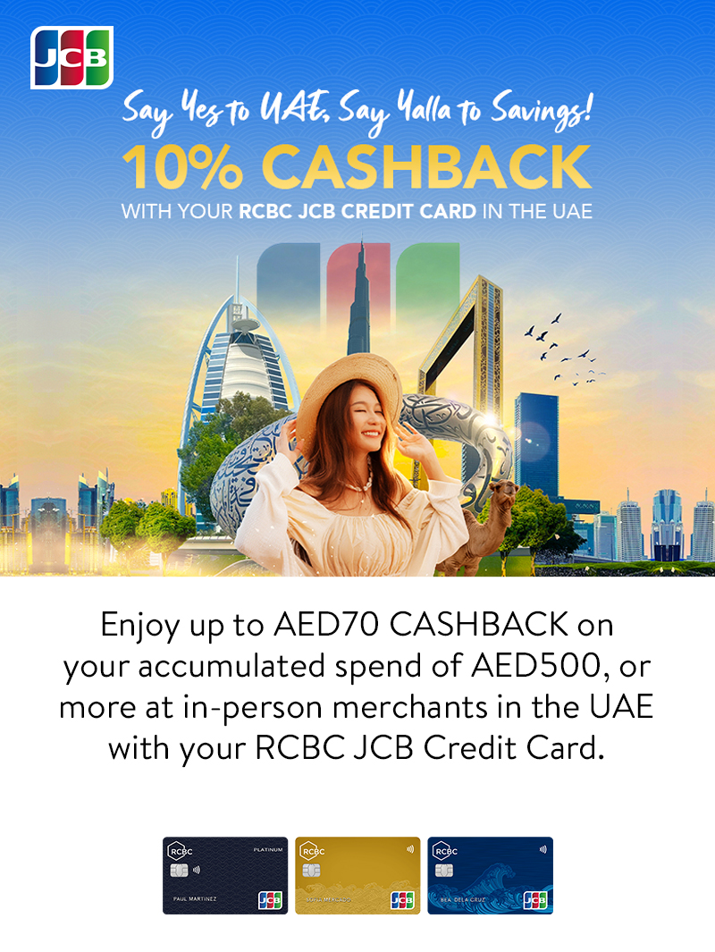- Traveling to UAE? Use your RCBC JCB Credit Card to spend a total of AED500 or more at in-person merchants in the UAE from January 15 to March 15, 2026.
