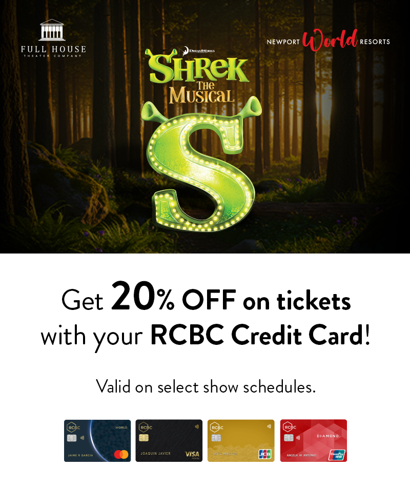 - To avail of the discount, cardholders must purchase via https://premier.ticketworld.com.ph with their RCBC Credit Card using the promo code RCBCSHREK20 during the promo period: