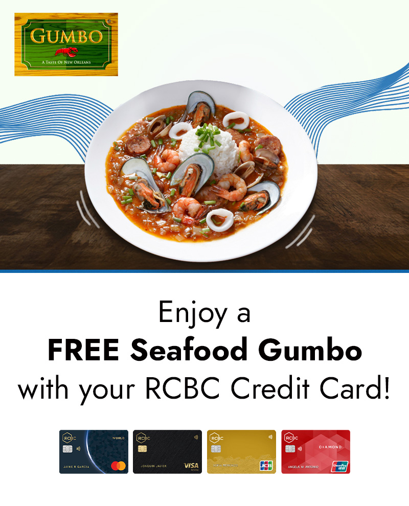 Blackout dates apply: Government-declared regular and special holidays and promotional events designated by the restaurant - Cardholders are entitled to get a FREE Seafood Gumbo (regular) for a minimum single-receipt food spend of ₱1,000 and one (1) drink, exclusive of service charge, at Gumbo using their RCBC Credit Cards during the promo period.