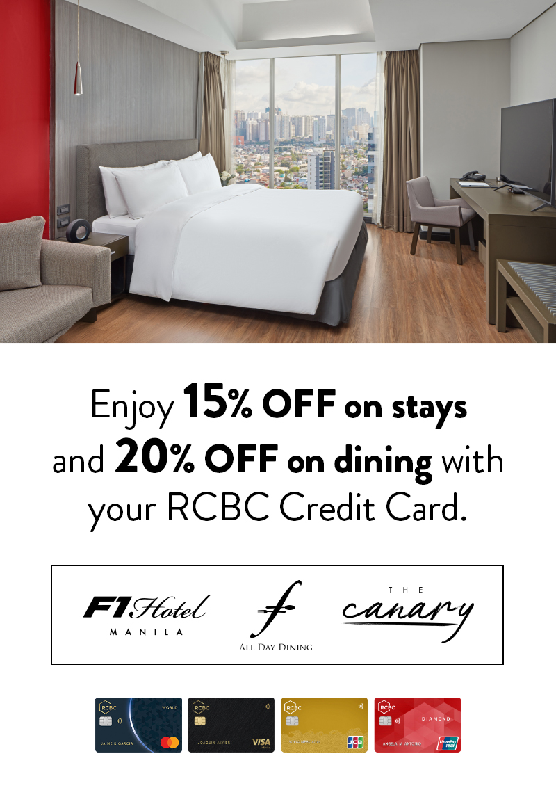 - Promo is not valid in conjunction with other existing promotional offers of RCBC Credit Cards and F1 Hotel Manila.