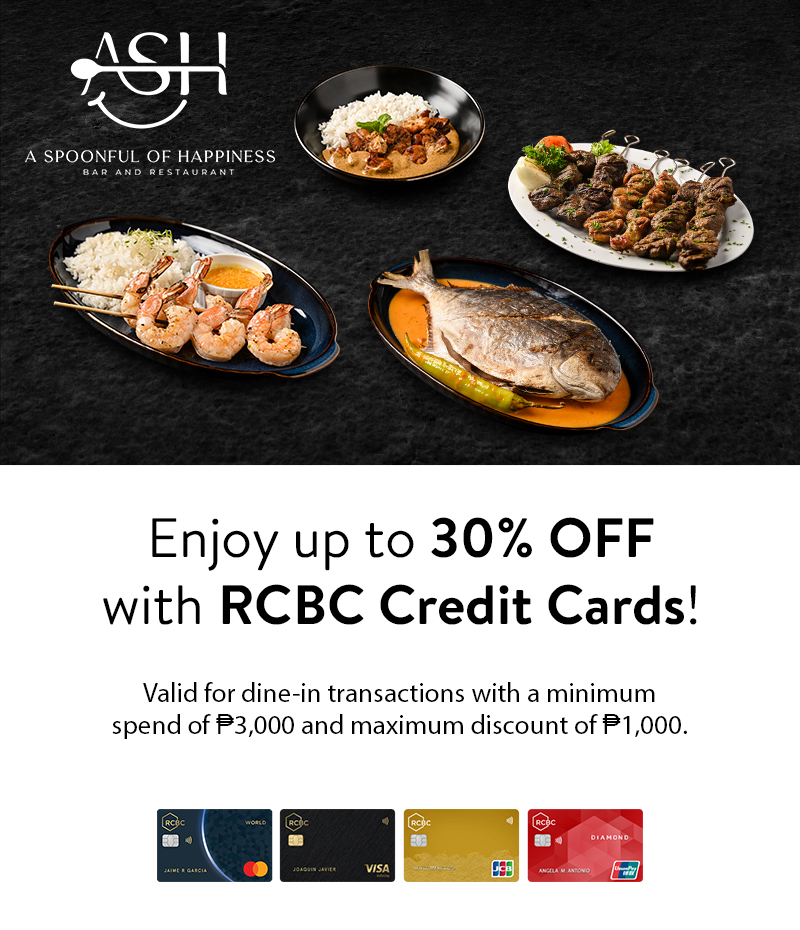 - Cardholders can avail of up to 30% OFF (maximum discount of ₱1,000) on their total bill for a minimum spend of ₱3,000 using their RCBC Credit Cards during the promo period.